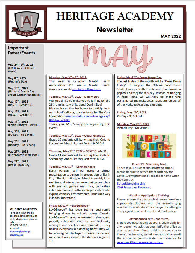 May NewsletterMay 9, 20221 min readThe May 2022 Newsletter has been sent out to all Heritage Academy Families. If you did not receive yours, please contact Ms. Rachel Lee @ reception@heritage-academy.com.